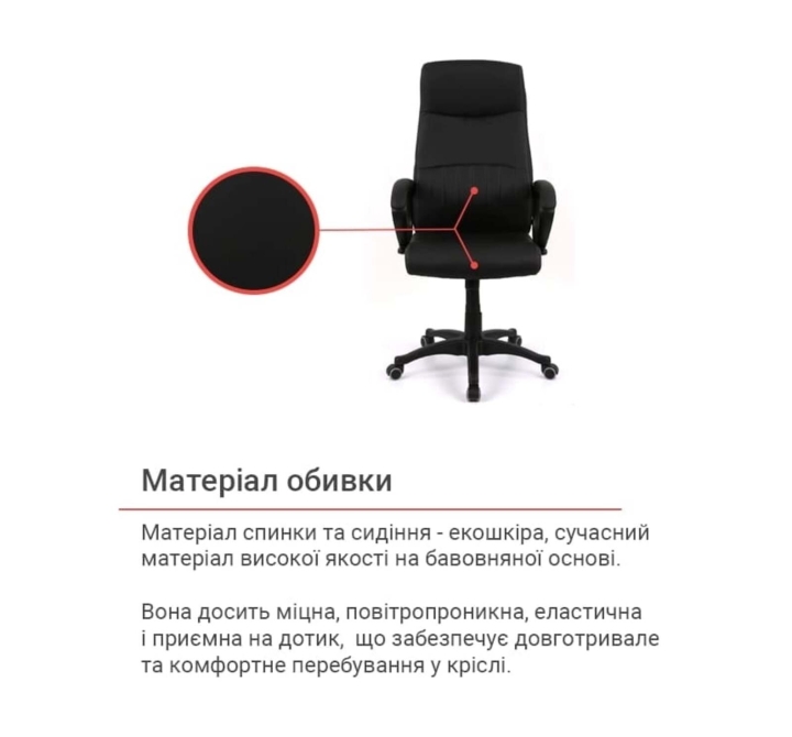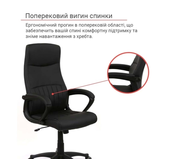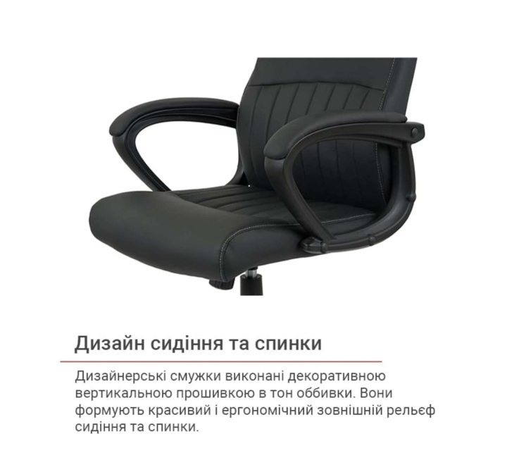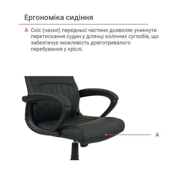 Особенности. Модель имеет большие габариты, высокую спинку, глубокую и широкую посадку, а значит отлично подойдёт для людей и высокого, и среднего роста. Посадка достаточно удобная, сидение большое и мягкое. В основе сидения используется гнутоклеёная фанера с поролоновым наполнением под обивкой. Углубление по центру сидения и скошенный передний край уберегут сосуды ног от пережимания, а ноги от накопления усталости к концу рабочего дня.