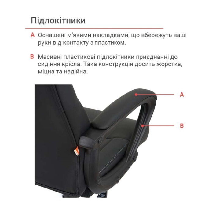 Подлокотники. Подлокотники изогнутой эргономичной формы изготовлены из прочного пластика чёрного цвета с мягкими накладками.
