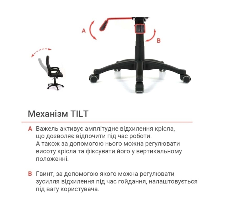 Механизмы. В данной модели установлен современным механизм качания Tilt. Этот популярный механизм с возможностью фиксации в рабочем положении, который поможет Вам разнообразить рабочее время минутами приятного отдыха. Находясь в любимом кресле, вы отдыхаете, даже не прерывая важный телефонный звонок или продолжая составлять важный отчёт. Механизм достаточно просто отрегулировать под конкретный вес пользователя с помощью цилиндрической ручки под сидением. Газлифт поможет установить оптимальную для Вашего роста высоту сидения.