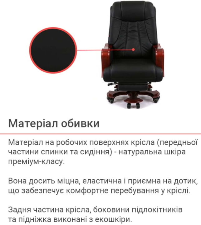 Для пошива чехла на рабочих поверхностях используется натуральная кожа коровы, а именно на передней части спинки, сиденье и подлокотниках.На нерабочих поверхностях - экокожа, а именно искусственный материал на тканевой подкладке на боковых вставках, задней части спинки.