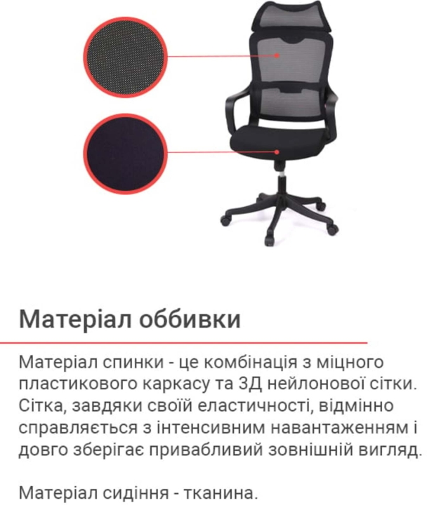 Обивка. Обивка спинки кресла – сетка, натянутая на крепкий пластиковый каркас, с которой вы будете комфортно чувствовать себя даже в самый жаркий день благодаря ее свойствам. Этот материал отлично справляется с интенсивной нагрузкой и долго сохраняет свои свойства и привлекательный внешний вид благодаря своей эластичности, повышенной воздухопроницаемости, прочности и износостойкости.