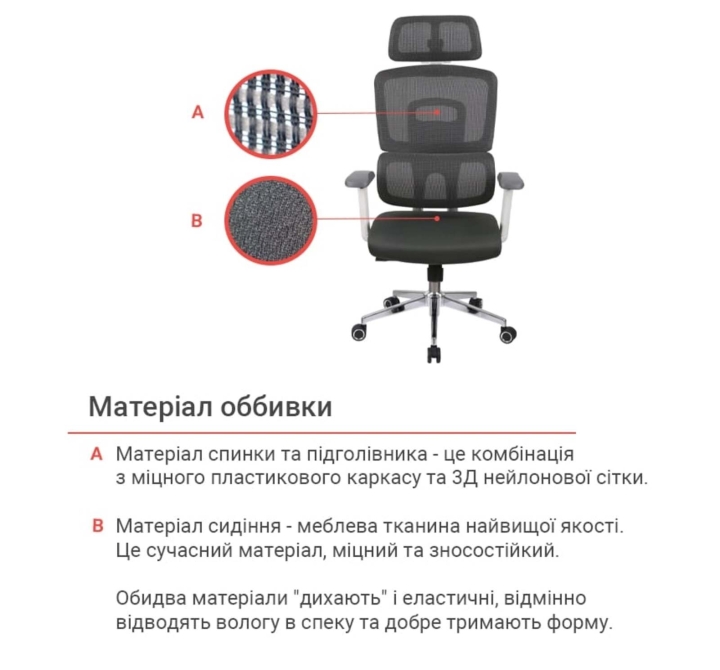 Оббивка. Оббивка крісла - сітка, натягнута на міцний пластиковий каркас, з якої ви будете комфортно себе відчувати навіть в самий спекотний день завдяки її "дихаючими" властивостями. Цей матеріал відмінно справляється з інтенсивним навантаженням і довго зберігає свої властивості та привабливий зовнішній вигляд, завдяки своїй еластичності, підвищеної повітропроникності, міцності і зносостійкості. Для сидіння використана більш щільна стільникова тканина, яка має ті ж властивості, що і сітка, але розрахована на більші навантаження.