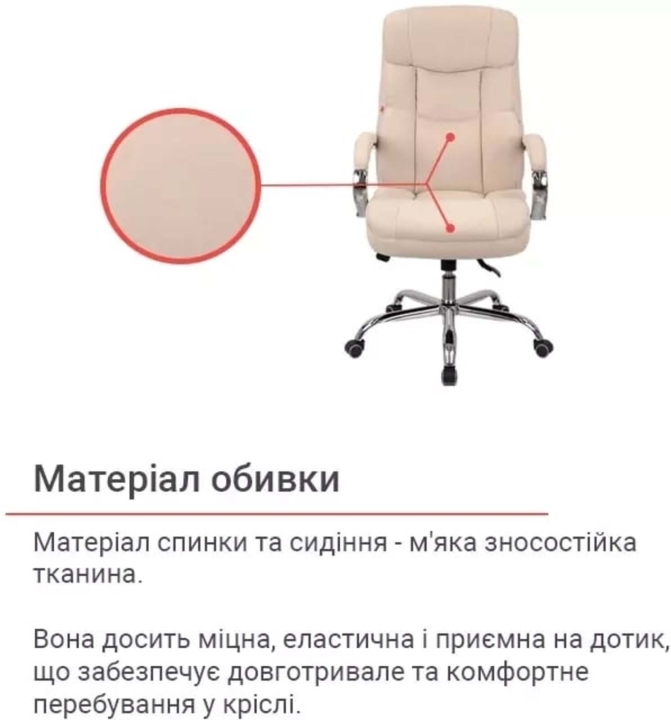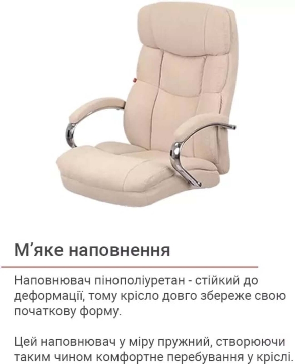 Оббивка. Для оббивки крісла використовується м'яка зносостійка тканина. Як наповнювач застосовують пінополіуретан, стійкий до деформації, тому крісло довго збереже свою первісну форму. Цей наповнювач у міру пружний, тому добре тримає форму. Створюючи таким чином підтримку спині сидячого. Якщо використовувати крісло згідно з рекомендаціями, воно прослужить вам максимально довго, зберігаючи не тільки свої фізичні властивості, але і ваше здоров'я.