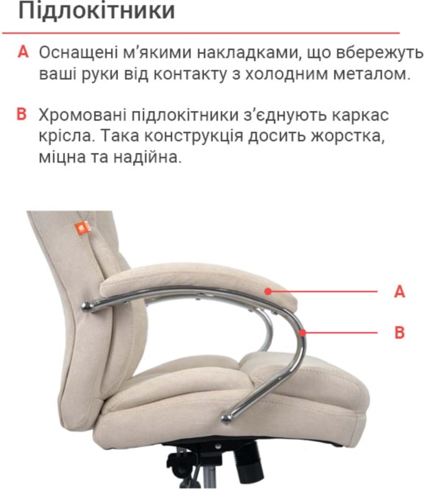 Подлокотники. Подлокотники изготовлены из металлической хромированной трубы. Овальная форма подлокотников в комплекте с мягкими накладками будут служить вашим рукам надежной и комфортной опорой. Удачно подобранные размеры и высота подлокотников позволят удобно разместить руки, когда плечи упираются и не устают во время долгого рабочего дня.