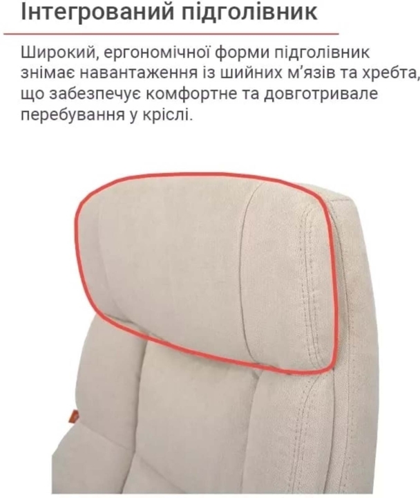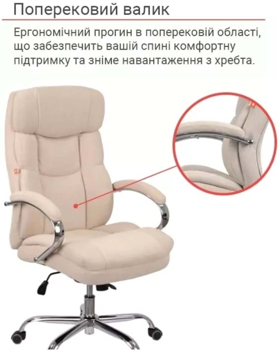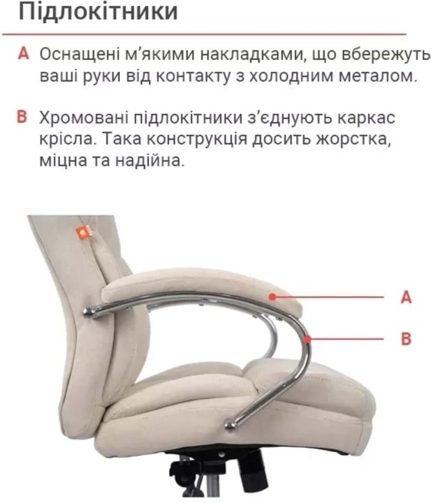 Підлокітники. Підлокітники виготовлені з хромованої металевої труби. Овальна форма підлокітників в комплекті з м'якими накладками будуть служити вашим рукам надійною і комфортною опорою. Вдало підібрані розмір і висота підлокітників дозволять зручно розмістити руки, коли плечі впираються і не втомлюються під час довгого робочого дня.