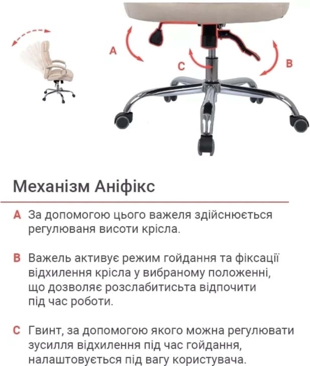Механізми. Вбудований механізм гойдання підвищеної комфортності аніфікс дає можливість влаштувати для себе улюбленого сеанс релаксу, не перериваючи важливий телефонний дзвінок або продовжуючи становити грандіозні плани підкорення бізнес-олімпу, а після зайнятися поточними справами, зафіксувавши крісло в зручному положенні. Надійний газо-масляний амортизатор дозволяє змінити висоту крісла з урахуванням вашого зросту.