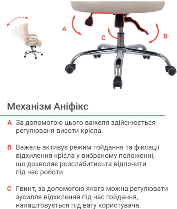 Механизмы. Встроенный механизм качания повышенной комфортности анификс дает возможность устроить себе любимый сеанс релакса, не прерывая важный телефонный звонок или продолжая составлять грандиозные планы покорения бизнес-олимпа, а после заняться текущими делами, зафиксировав кресло в удобном положении. Надежный газомасляный амортизатор позволяет изменить высоту кресла с учетом вашего роста.