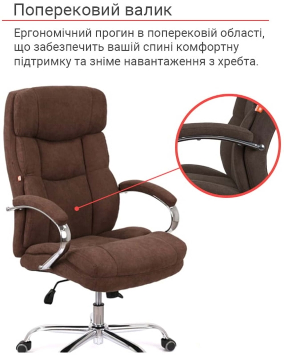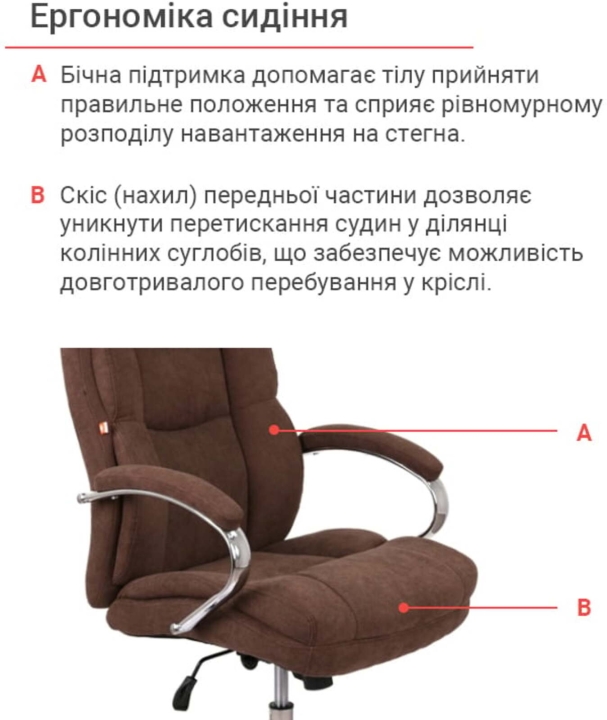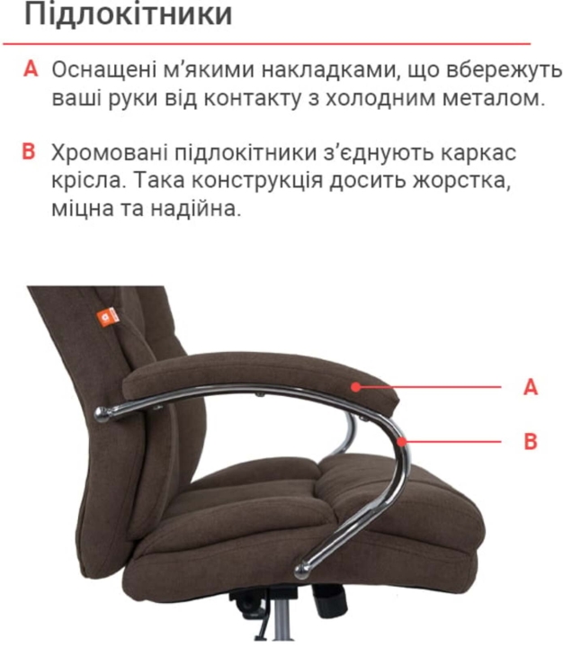 Подлокотники. Подлокотники изготовлены из металлической хромированной трубы. Овальная форма подлокотников в комплекте с мягкими накладками будут служить вашим рукам надежной и комфортной опорой. Удачно подобранные размеры и высота подлокотников позволят удобно разместить руки, когда плечи упираются и не устают во время долгого рабочего дня.