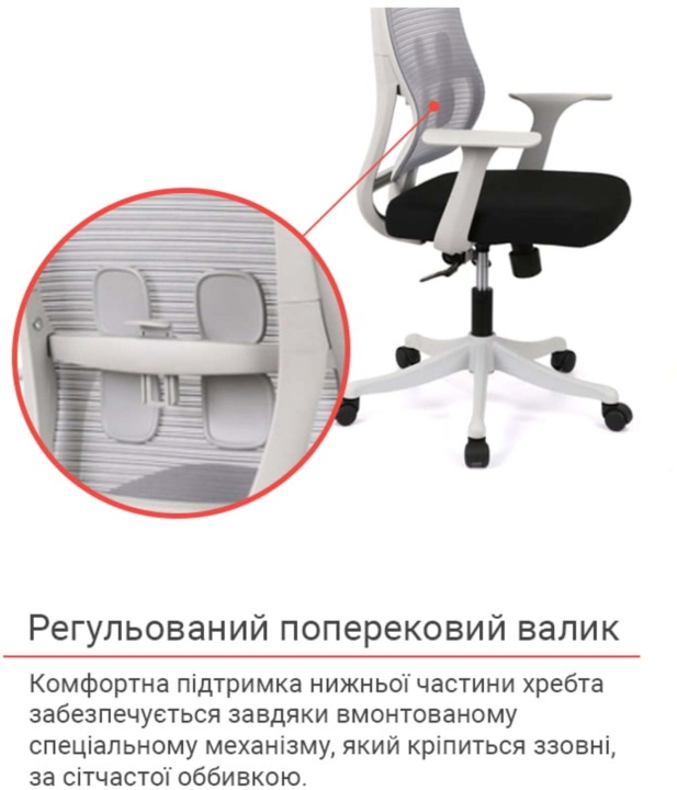 Хрестовина. Ця модель комплектується міцною пластиковою хрестовиною. Пластикові ролики забезпечать крісло необхідну мобільність на будь-якому покриття для підлоги.
