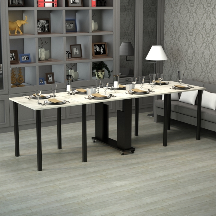 Кухонний стіл-книжка "Діалог" - це компактний, багатофункціональний розкладний стіл, який економить простір Вашої оселі! В складеному вигляді займає дуже мало місця. Можливе розкладання у кількох варіантах в залежності від потреби. При максимальному розкладанні має довжину 2 метри 74,5 см, що дозволяє розмістити за столом 10-12 чоловік. Наявність колес забезпечує мобільність та легкість у переміщені столу.Колір: Дуб Крафт Білий; ДСП: 18 мм; Крайка: пластик 0,5; Колеса: пластикові на металевій основі; Опори: металеві - 710х60 мм (чорний).Розміри:- у складеному вигляді: 800х190х730 (мм);- у напіврозкладеному вигляді: 800х1470х730 (мм);- у розкладеному вигляді: 800х2750х730 (мм). Хочемо звернути Вашу увагу на те що, всі столи які мають систему розкладання таку як "стіл-книжка", можуть містити: невеликий люфт в місцях стиковки стільниць, перепади між стільницями 1- 2 мм, а також зазори між стільницями 1-2 мм. Це є нормою і конструктивною особливістю столів, саме з таким механізмом розкладання.Стіл поставляється у зібраному вигляді - розпакуй та користуйся!Термін доставки від 2 до 10 робочих днів в залежності від наявності на складі.Відвантаження (1 місце):1 місце - вага: 36 кгГабарити: 82*21*68 см