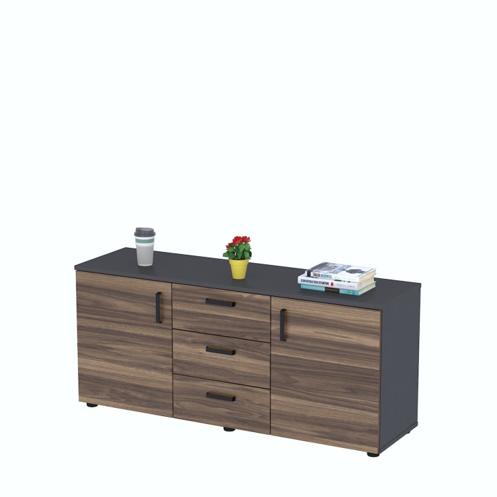 Модель оснащена тремя выдвижными ящиками по центру и двумя распашными дверцами по бокам, что обеспечивает удобное хранение различных вещей. Верхнюю поверхность тумбы можно использовать в качестве дополнительного функционального пространства. Центральные ящики оснащены телескопическими направляющими, которые обеспечивают их полное и плавное выдвижение.