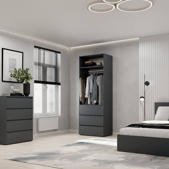 Внутреннее пространство шкафа продумано до мелочей: штанга для одежды, полки для аксессуаров и нижняя полка для обуви обеспечивают порядок и легкий доступ к вещам. Две двери с элегантными ручками не только добавляют стиля, но и гарантируют удобство использования. Петли с доводчиком. Кромка, открытые элементы - 1 мм ПВХ, остальные - 0,5 мм ПВХ. Направляющие ящиков - телескопические.