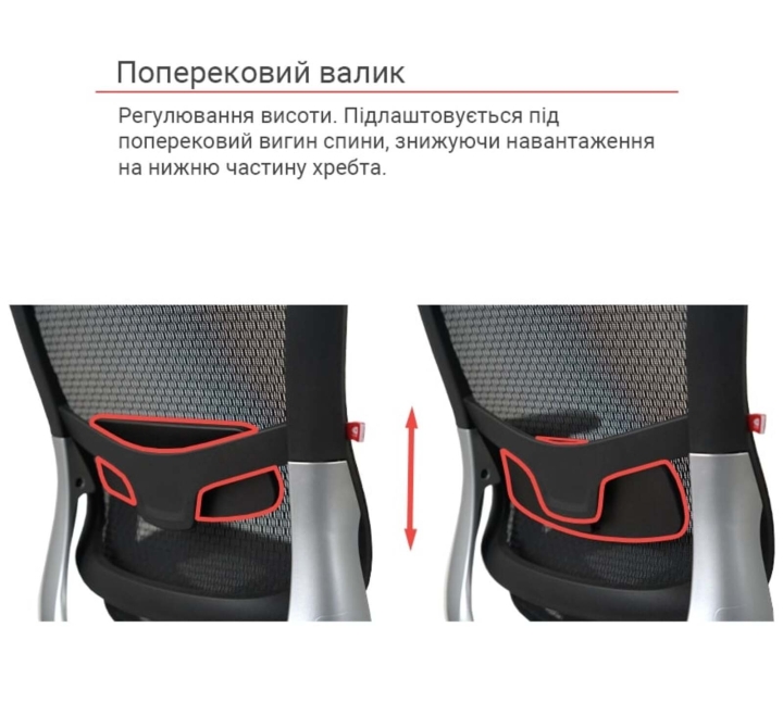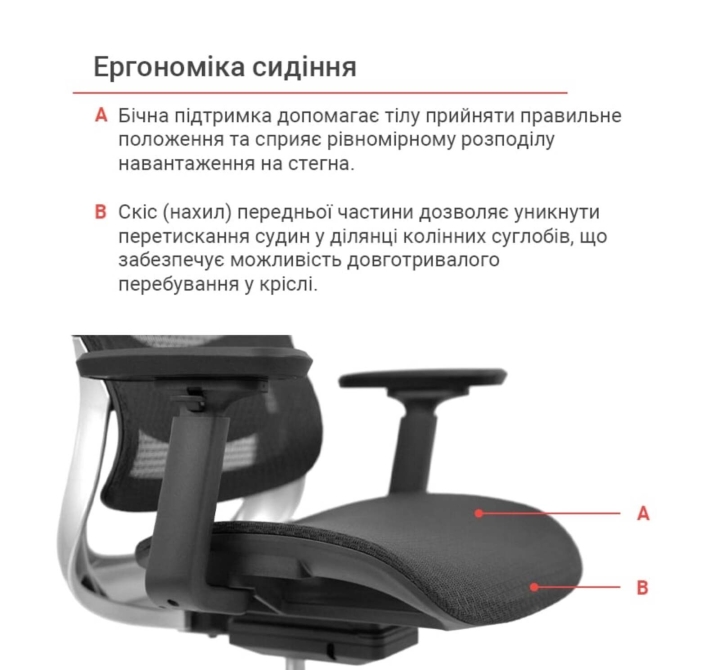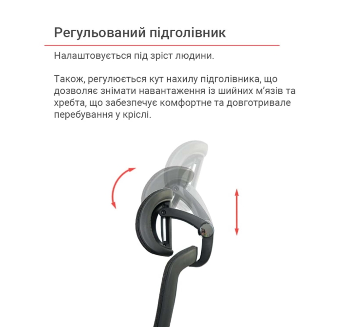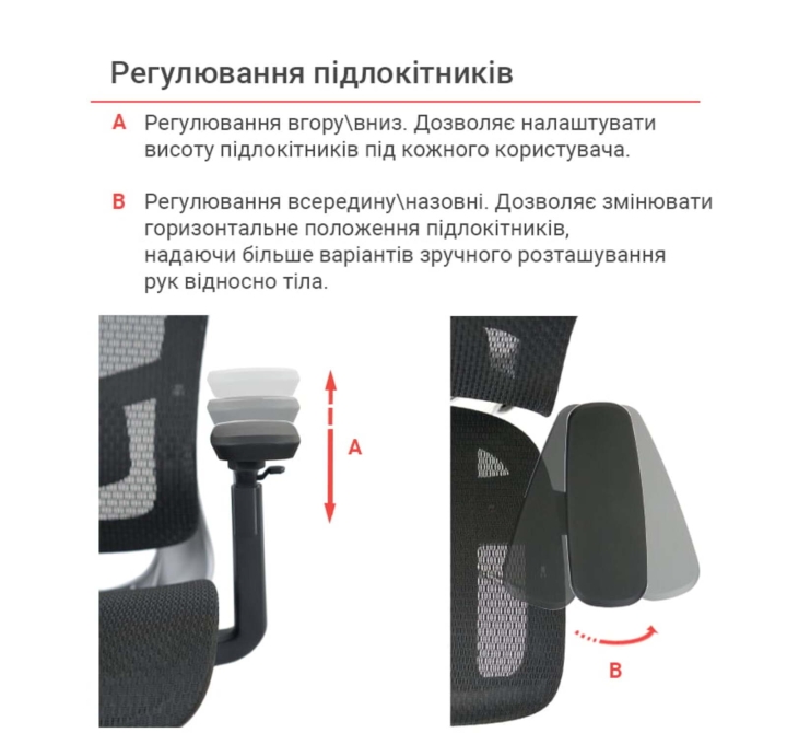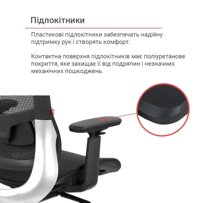 Подлокотники. Кресло оснащено регулируемыми по высоте подлокотниками, что позволяет пользователю настроить их оптимальное положение для поддержки рук и плеч. Это способствует снижению напряжения в шейно-плечевой зоне и повышает общий комфорт во время работы.