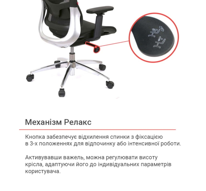 Особенности. Регулировки подголовника, поясничной поддержки и подлокотников по высоте обеспечивают индивидуальную адаптацию кресла под потребности каждого пользователя. Механизм Синхрорелакс способствует расслаблению и правильному положению тела на протяжении всего рабочего дня, уменьшая нагрузку на позвоночник. "Дышащая" сетчатая обивка обеспечивает комфортный микроклимат, а прочная металлическая крестовина с колесиками гарантирует устойчивость и мобильность.