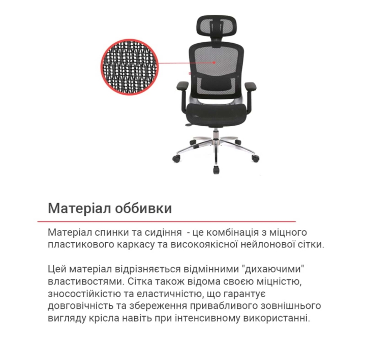 Обивка. Для обивки кресла использована высококачественная сетка. Этот материал отличается отличными "дышащими" свойствами, что обеспечивает комфорт даже в жаркую погоду. Сетка также известна своей прочностью, износостойкостью и эластичностью, что гарантирует долговечность и сохранение привлекательного внешнего вида кресла даже при интенсивном использовании.