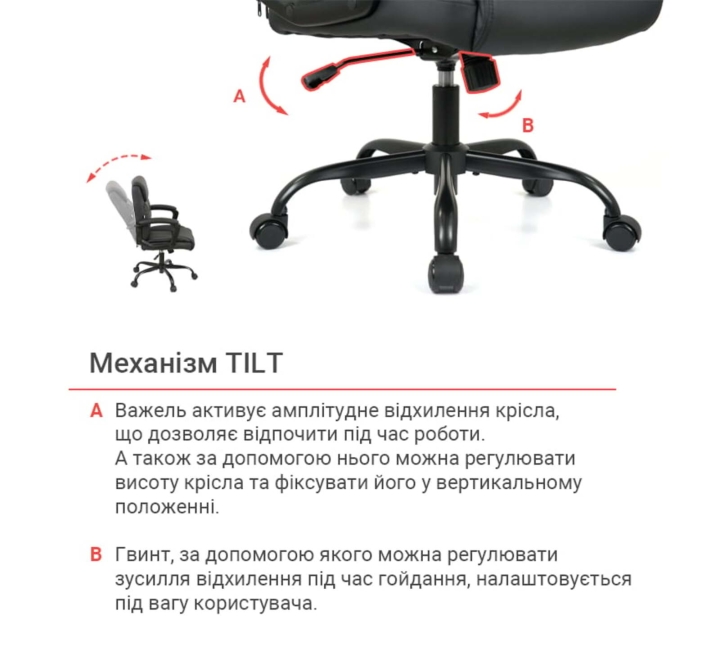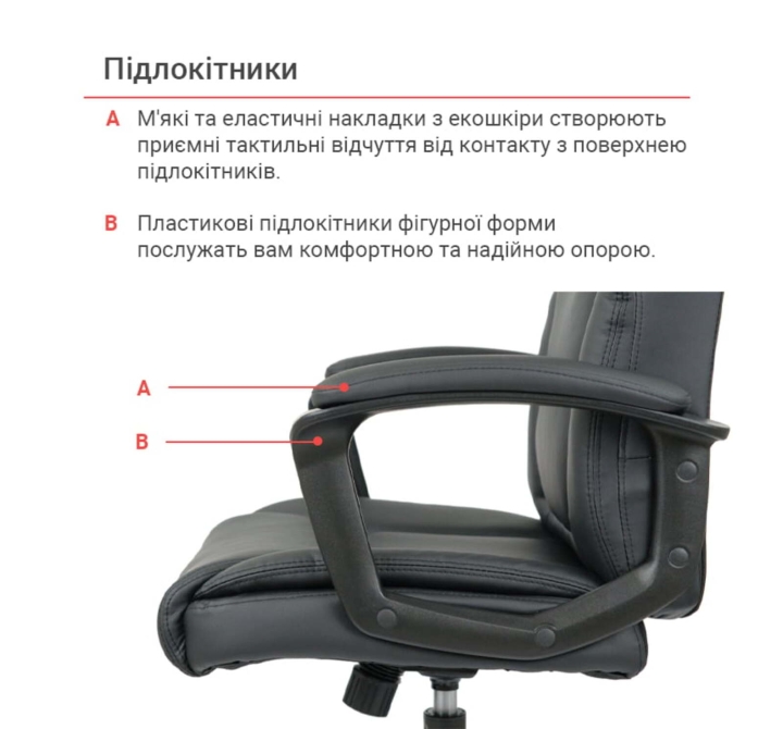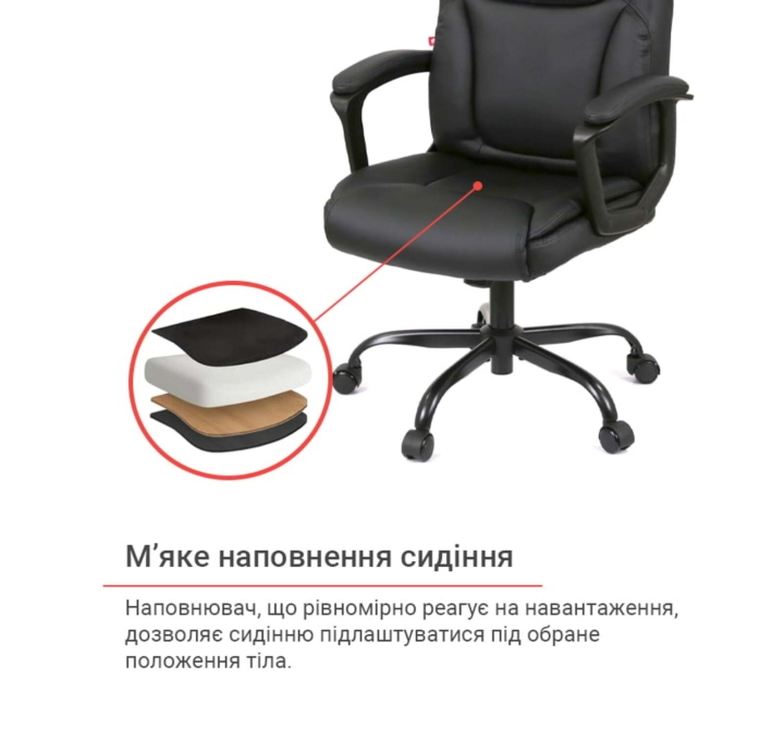 Крісло АКЛАС Лівар TILT 10002M (PU Black) - це втілення класичного комфорту та надійності, розроблене для тих, хто цінує перевірені рішення та зручність протягом усього робочого дня. Його традиційний, але елегантний дизайн та функціональність роблять його ідеальним вибором для будь-якого офісу або домашнього кабінету, забезпечуючи необхідну підтримку та комфорт. Дизайн. Модель відрізняється солідним та універсальним дизайном, що гармонійно впишеться в різноманітні інтер'єри. Класична форма спинки та сидіння з м'якими об'ємними елементами створює враження затишку та запрошує до тривалого використання. Чорний колір оббивки та основи підкреслює практичність та стриману елегантність крісла. Оббивка. Для оббивки крісла використана високоякісна екошкіра. Цей матеріал вирізняється не лише привабливим зовнішнім виглядом, що імітує натуральну шкіру, але й високою зносостійкістю, довговічністю та легкістю у догляді. Екошкіра стійка до механічних пошкоджень та забруднень, що забезпечує збереження привабливого вигляду крісла протягом тривалого часу навіть при інтенсивному використанні. М'яке наповнення сидіння та спинки забезпечує високий рівень комфорту. Підлокітники. Крісло оснащене фіксованими, але ергономічно вигнутими підлокітниками, що забезпечують зручну підтримку для рук та плечей. Вони гармонійно доповнюють загальний дизайн крісла та сприяють правильному положенню користувача під час роботи. Механізми. Крісло обладнане механізмом гойдання Тілт, який дозволяє вільно гойдатися, фіксувати крісло в одному (робочому) положенні або налаштовувати жорсткість гойдання відповідно до ваги користувача. Це забезпечує можливість легкого перемикання між робочим режимом та режимом відпочинку. Надійний газліфт дає змогу легко та плавно регулювати висоту сидіння, підлаштовуючи крісло під індивідуальні параметри користувача та висоту робочої поверхні. Особливості. Класичний дизайн та зручні м'які форми роблять крісло ідеальним для повсякденного використання. Механізм Тілт дозволяє користувачеві розслабитись під час перерв, а надійна конструкція з міцною металевою хрестовиною та коліщатками забезпечує стабільність та легкість переміщення. Зносостійка екошкіра гарантує довговічність та легкість у догляді.