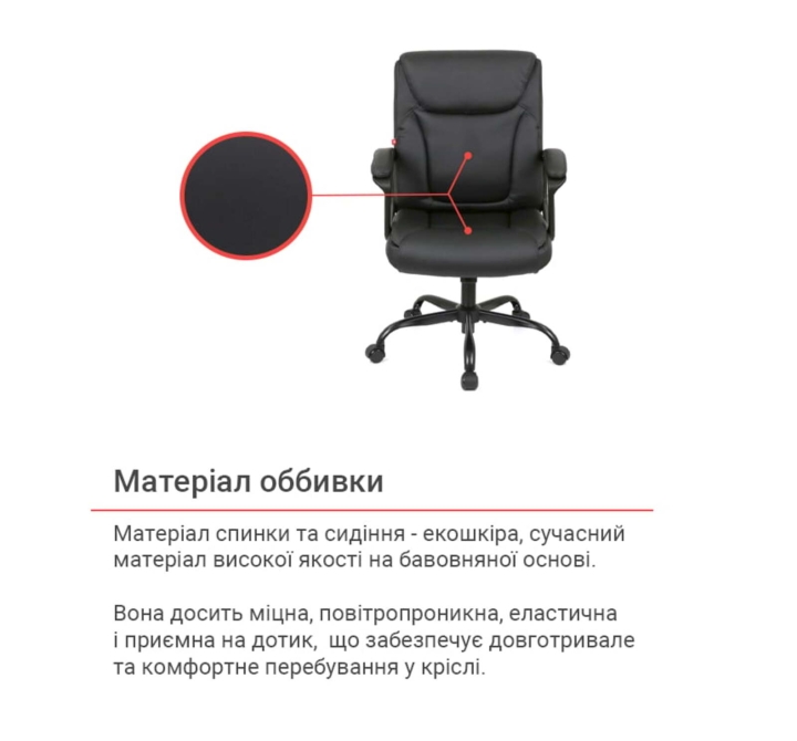 Обивка. Для обивки кресла использована высококачественная экокожа. Этот материал отличается не только привлекательным внешним видом, имитирующим натуральную кожу, но и высокой износостойкостью, долговечностью и легкостью в уходе. Экокожа устойчива к механическим повреждениям и загрязнениям, что обеспечивает сохранение привлекательного вида кресла в течение длительного времени даже при интенсивном использовании. Мягкое наполнение сиденья и спинки обеспечивает высокий уровень комфорта.