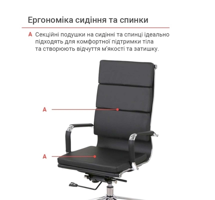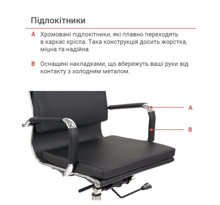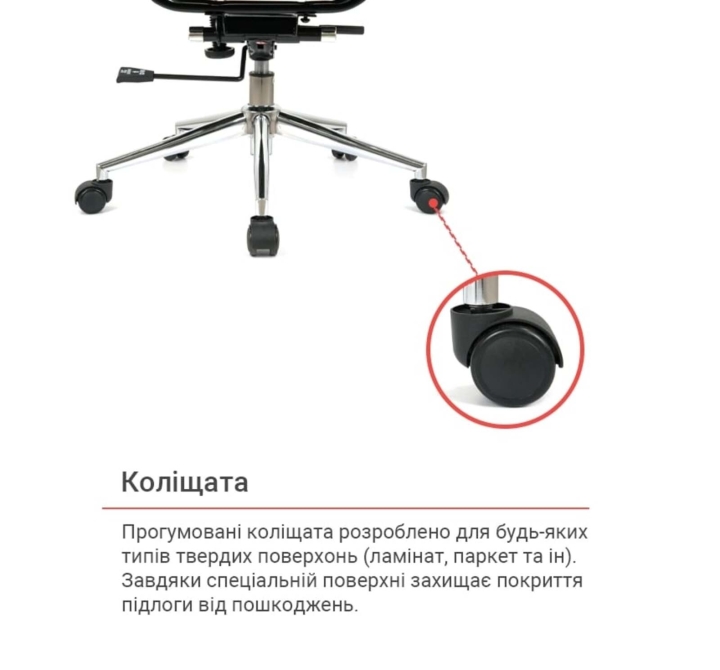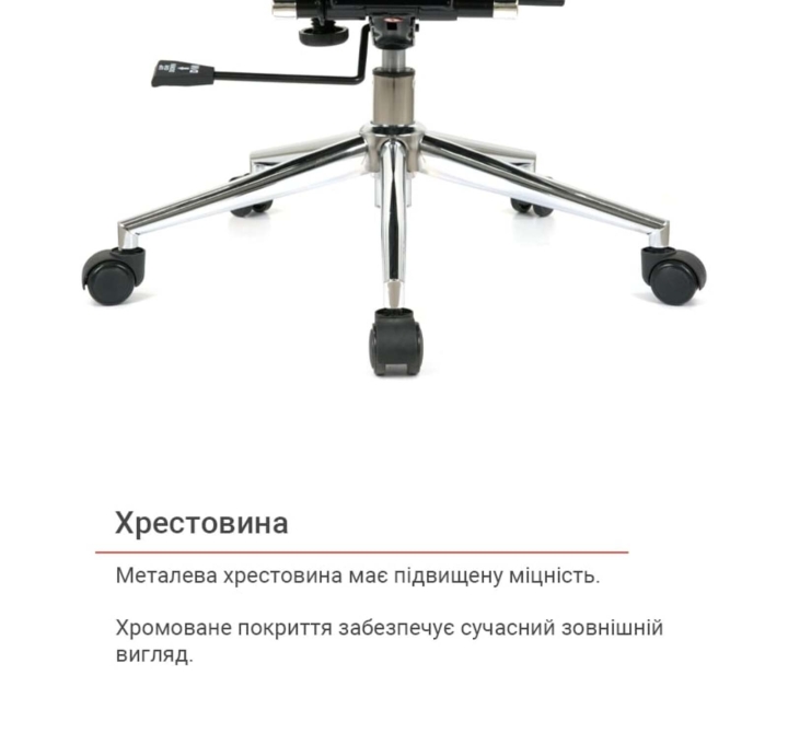 Крестовина. Крестовина кресла изготовлена из металла. Блестящее хромированное покрытие металла не только красивое, но и очень прочное. Оно не боится интенсивных нагрузок и не подвержено царапинам. Ролики обеспечат креслу необходимую мобильность.