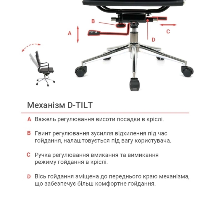 Механизмы. Дип-тилт, установленный в данной модели, это механизм качания, обеспечивающий глубокое качание, дающий возможность переключиться от режима работы в режим приятного релакса, не покидая рабочее место. Он фиксируется в рабочем (вертикальном) положении, а газлифт позволит отрегулировать высоту кресла так, чтобы вы устроились в нем с максимальным комфортом в соответствии с вашим ростом.