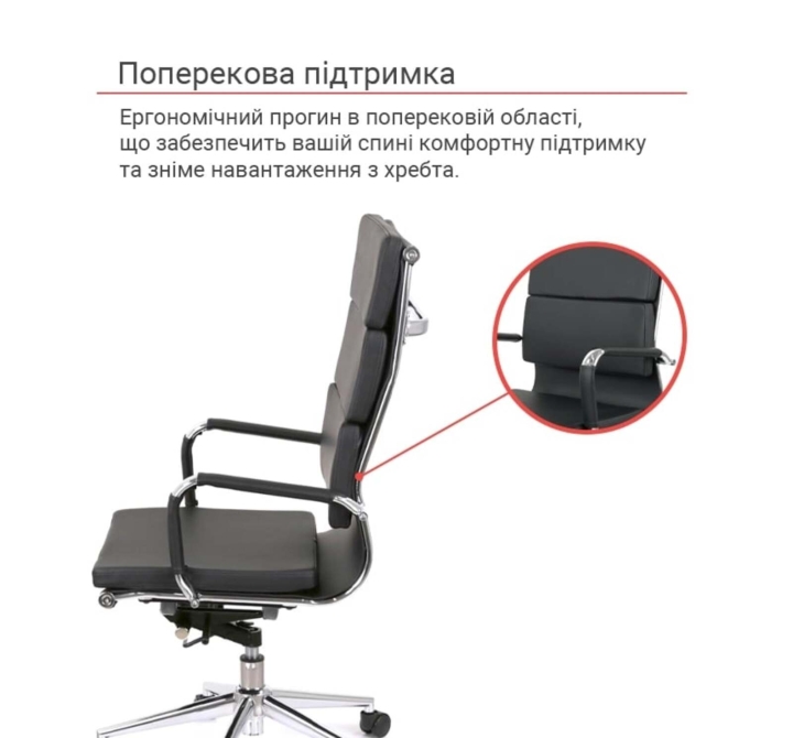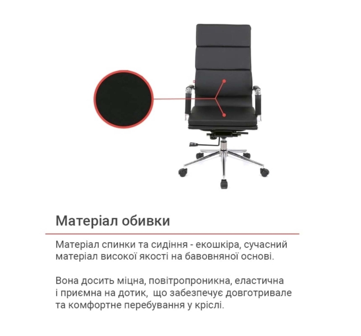 Обивка. Обивка этого кресла - это экокожа, современный материал высокого качества на хлопковой основе. Она достаточно прочная, воздухопроницаемая, эластичная и приятная на ощупь. По своим качествам экокожа практически не уступает натуральной коже и имеет при этом привлекательную цену. Этот материал неприхотлив в уходе и отлично справляется с интенсивной нагрузкой в условиях бешеного ритма современной офисной жизни.