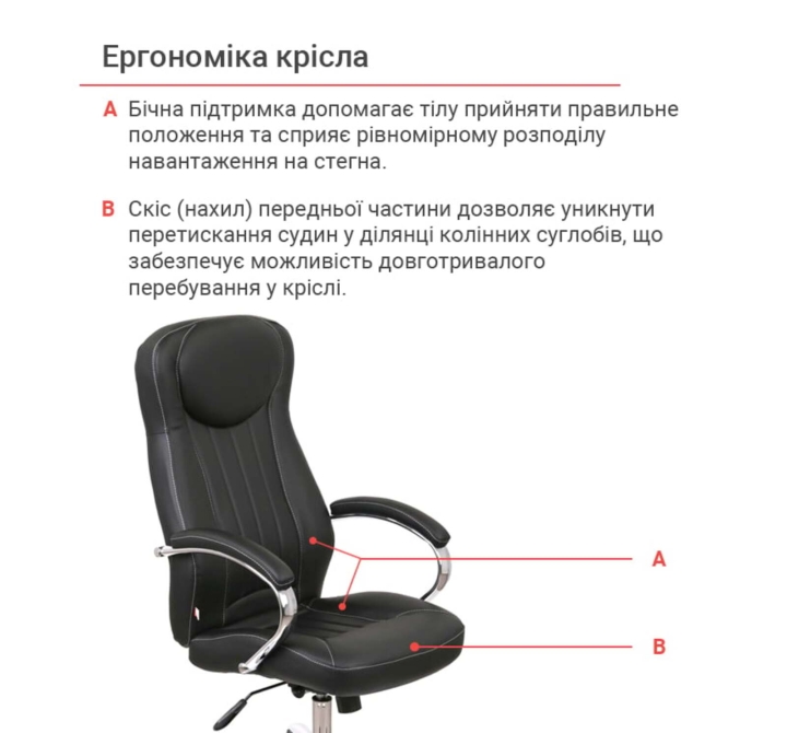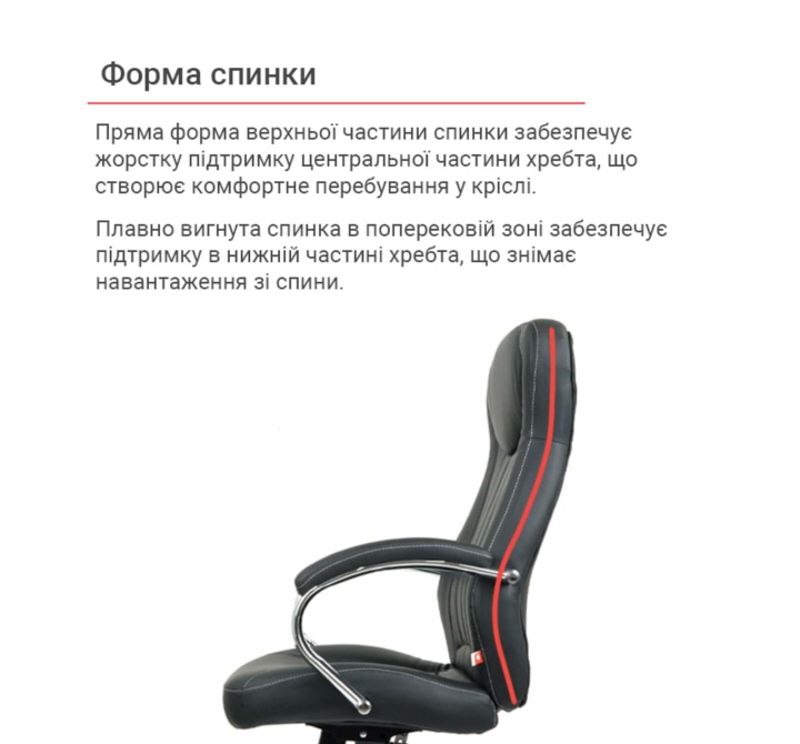 Обивка. Крісло оббите високоякісною екошкірою, що надає йому солідний та дорогий вигляд. Спинка та сидіння мають вертикальну прострочку, яка додає об'єму та візуальної привабливості.