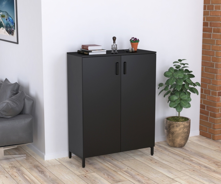 LT-900-1200 антрацит - это классическая высокая офисная тумба с двумя дверями и тремя полками внутри. Однако она имеет некоторые отличительные особенности, которые выделяют её среди аналогов. Это металлические опоры, которые придают внешне лёгкость и необычность, а также двухцветная расцветка, которая делает акцент на красивых фасадах и в тоже время отводит взгляд от громоздкого каркаса.