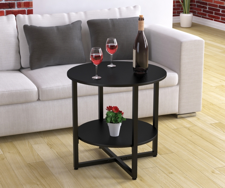 Столик состоит из разборного металлического каркаса, столешницы и нижней полки. Основание изготовлено из металлических труб 20х20 мм. Металл окрашен в черный цвет, методом порошкового напыления. Благодаря такому покрытию поверхность металла выглядит более эстетично и имеет длительный срок службы. В основании установлены регулируемые ножки. Они позволят компенсировать все неровности поверхности, а также защитят от возникновения царапин и потертостей на поверхности пола. Столешницы изготовлены из ЛДСП толщиной 16 мм. Из представленных цветов ЛДСП вы сможете выбрать именно тот, который подойдет под ваш интерьер. Для создания журнального столика использовали качественные и прочные материалы. Рекомендуем уберегать журнальный столик от влаги и высоких температур, чтобы он долгое время сохранял свой первоначальный внешний вид.