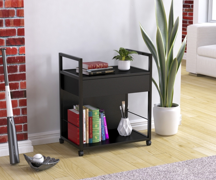 Тумба L-540 имеет вместительный ящик сверху на удобной высоте. Ящик выдвигается за нижнюю часть фасада. В этой модели используются телескопические направляющие полного выдвижения. В большую нишу под ящиком можно положить офисные принадлежности: папки-сегрегаторы, коробки с бумагой для принтера, книги и журналы. Также удобно использовать её для размещения сумочки и других личных вещей. Верхние перекладины предотвращаю падение предметов и в качестве ручки, если нужно переместить тумбу на другое место.