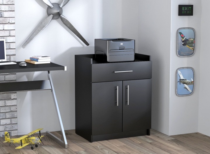 Тумба выполнена из премиального ЛДСП серии Wood толщиной листа 16 мм. Края ЛДСП проклеены кромкой 0,5 и 2 мм на немецком оборудовании, иcпользование которого позволяет качественно клеить кромку, тем самым увеличивая срок эксплуатации изделия. В данной модели используются качественные металлические рейлинговые ручки 128 мм. К нижней части тумбы для принтера крепятся пластиковые прокладки для защиты напольного покрытия. Выдвижной ящик крепится с помощью роликовых направляющих 35 см класса Люкс. Дверцы крепятся на металлические петли.