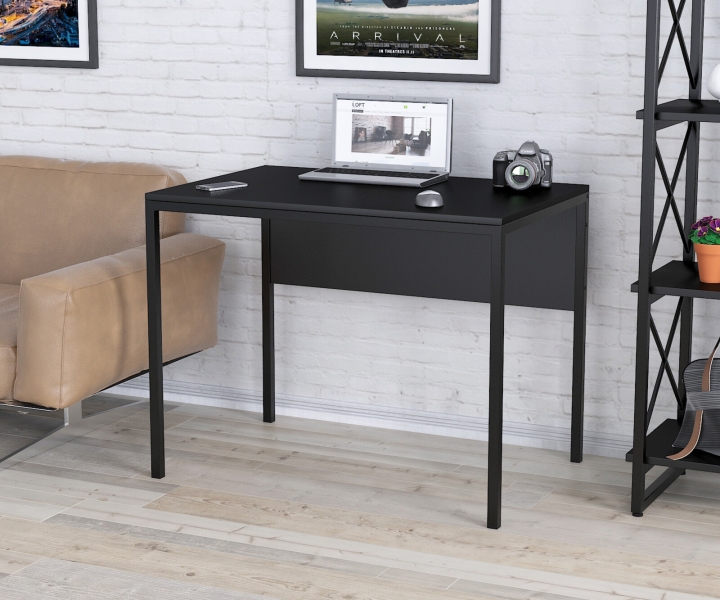 Ширина стола равна 920 мм, глубина – 650 мм, высота – 750 мм. Для изготовления подобраны высококачественные материалы, которые обеспечат долговечность. Материал столешницы – ламинированное ДСП, обладающее высокой износостойкостью. Каркас изготовлен из металлического профиля 25х25 мм, толщиной 1,4 мм. Металл покрыт порошковой краской черного матового цвета. В сочетании с фактурами ДСП черный каркас выглядит как изящная окантовка к изделию.