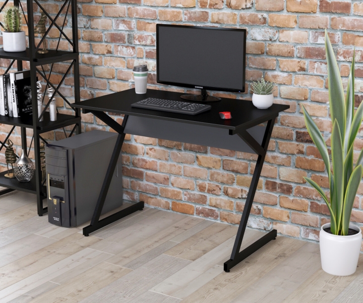 Стол L-7 имеет оригинальную конструкцию корпуса, которая ломает наши стереотипы о столах. Вместо привычных нам четырёх опор, здесь две Z-образные ножки, выполненные из металлической трубы 40*20 мм. Между ногами установлена балка жесткости из ДСП в цвете антрацит, а под столешницей имеется металлическая балка, которая поддерживает столешницу. Металлический каркас выполнен из прочного металла толщиной листа 1,4 мм. Металл окрашен чёрной порошковой краской с матовым оттенком, которая устойчива к физическим воздействиям. Внизу опор имеются маленькие регулируемые ножки, предназначенные для компенсации неровностей пола.Столешница изготовлена из ламинированного ДСП толщиной 18 мм. По периметру она оклеена двух миллиметровой кромкой из ПВХ. ДСП представлено в пяти расцветках: Венге Луизиана, Орех Модена, Дуб Палена, Дуб Борас, Белый и Антрацит.