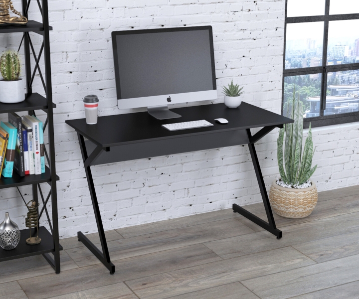 Металлический каркас выполнен из прочного металла с толщиной стенки 1,4 мм. Помимо Z-образных ножек у стола имеется металлическая балка, которая поддерживает столешницу снизу. Между ногами установлена балка жесткости из ДСП в цвете антрацит. Металл окрашен чёрной порошковой краской с матовым оттенком, которая устойчива к физическим воздействиям. Внизу опор имеются маленькие регулируемые ножки, предназначенные для компенсации неровностей пола.