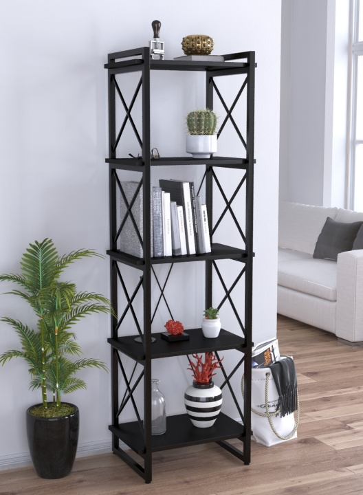 Металлические опоры стеллажи имеют декоративные крестообразные вставки, на которые можно облокачивать предметы. Прочный каркас является надёжной опорой для полок. Он просматривается со всех сторон, акцентируя внимание на предметах, лежащих на полках. А аккуратное исполнение деталей стеллажа и геометрическая гармония конструкции подчеркивает тонкий вкус владельца помещения.