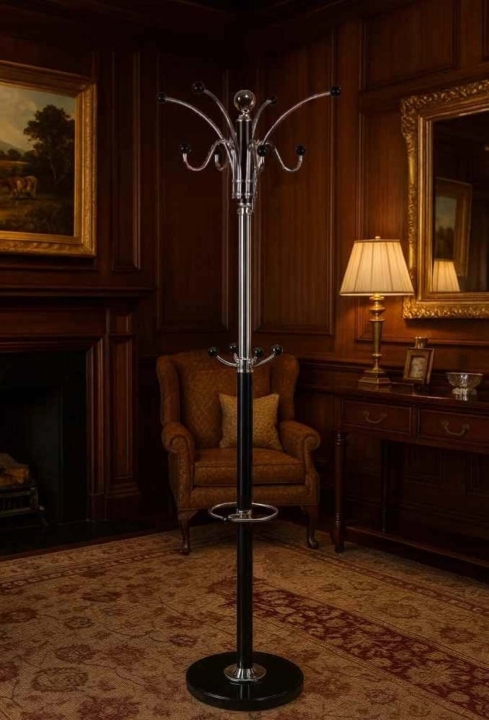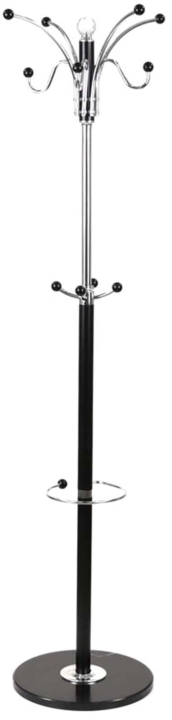 Верхняя часть стойки хромированная и имеет два яруса крючков. Верхний ярус состоит из 4 изогнутых хромированных крючков, каждый из которых заканчивается декоративным черным шариком. Эта форма напоминает разветвленную крону дерева или изящные завитки. Ниже расположены еще 4 хромированных двойных крючка, также с черными шариками на концах. На самом верху стойки расположен декоративный хромированный шар, добавляющий завершенности.