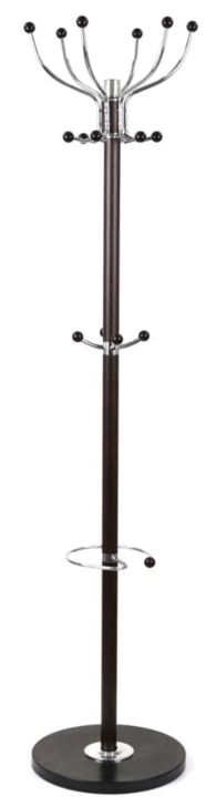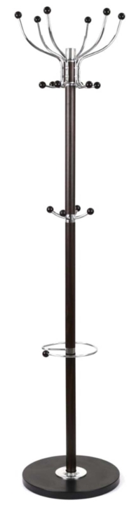 Вешалка напольная АКЛАС Горобына VKY-6256 178x38 (Темно-коричневый). Идеально подходит для прихожих, вестибюлей, офисов, гостиниц или любых помещений, где требуется стильное и функциональное решение для хранения верхней одежды, головных уборов, сумок и зонтов. Дизайн является сочетанием классической элегантности и современной функциональности. Комбинация темно-коричневого цвета и блестящего хрома придает вешалке респектабельный и изысканный вид.