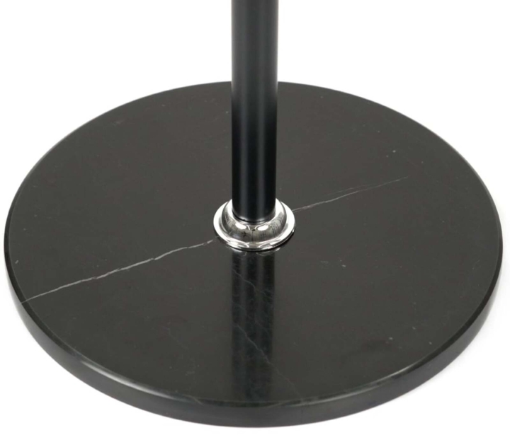 Основа вешалки - это круглая, плоская платформа черного цвета, изготовленная из мрамора для обеспечения устойчивости. Между стойкой и основой присутствует тонкий металлический акцент, что придает изделию современный вид.