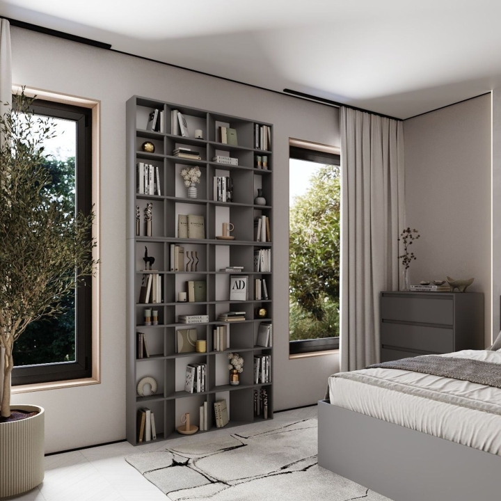Уникальный дизайн с внутренними перегородками, расположенными под углом 45°, формирует выразительную геометрию и придаёт интерьеру динамику и современный характер. В зависимости от освещения и угла обзора стеллаж выглядит по-разному, меняя восприятие пространства. Даже без наполнения он выступает самостоятельным декоративным элементом.