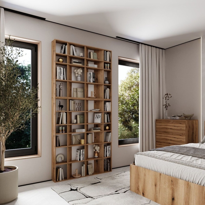 Уникальный дизайн с внутренними перегородками, расположенными под углом 45°, формирует выразительную геометрию и придаёт интерьеру динамику и современный характер. В зависимости от освещения и угла обзора стеллаж выглядит по-разному, меняя восприятие пространства. Даже без наполнения он выступает самостоятельным декоративным элементом.