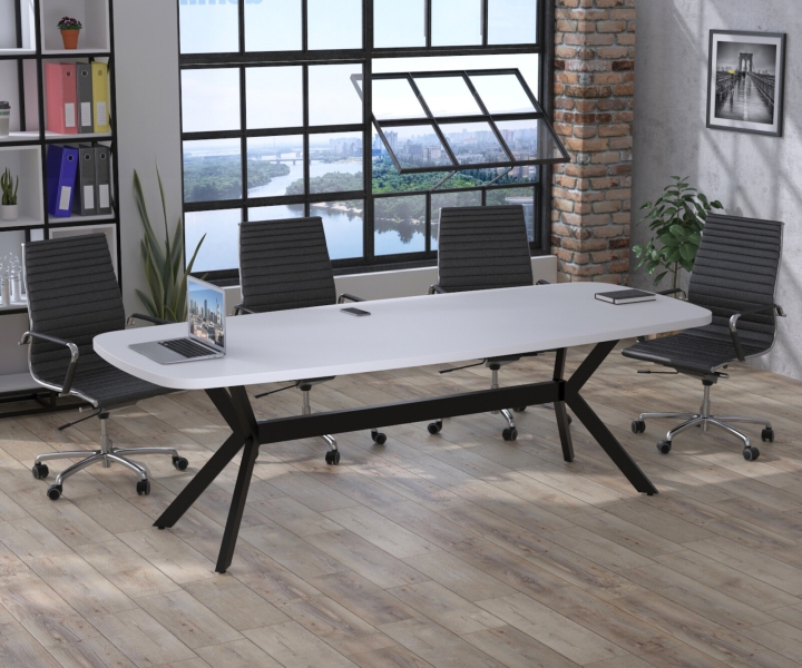 Благодаря закруглённым краям стол выглядит элегантно и безопасно, создаёт более мягкую и располагающую атмосферу для общения. Конструкция стола включает прочные металлические опоры, соединённые нижней перегородкой из ДСП, массивную столешницу и возможность установки встроенных розеток.