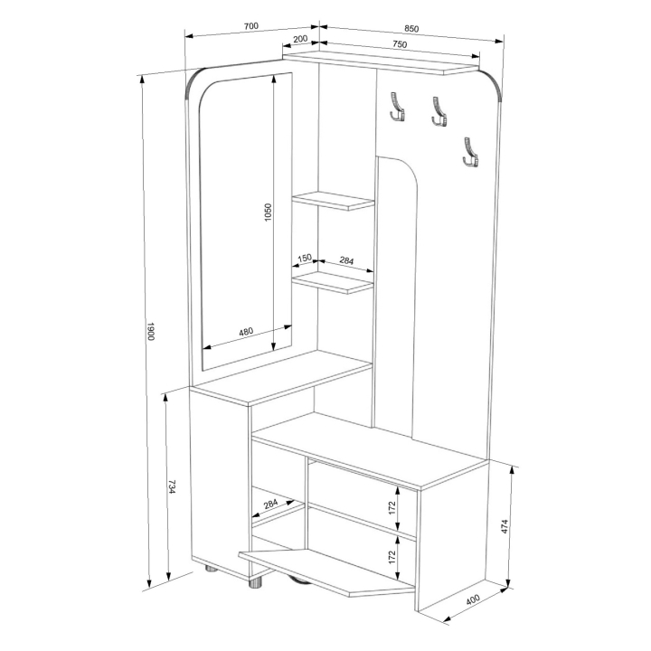 Розміри передпокою: ширина - 850 мм (85 см); глибина - 700 мм (70 см); висота - 1900 мм (190 см).