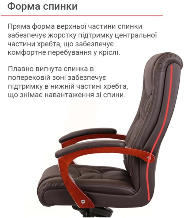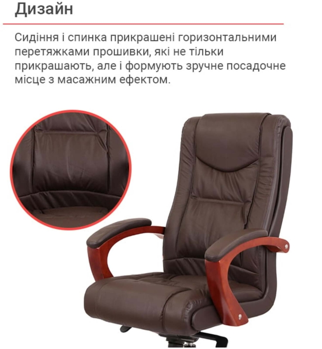 Дизайн. Просто, але в той же час вишукано - ось як можна охарактеризувати це крісло. Силует досить лаконічний, але завдяки вдалому поєднанню шкіри і дерева він виглядає багато. Сидіння і спинка прикрашені горизонтальними перетяжками прошивки, які не тільки прикрашають, але і формують зручне посадочне місце з масажним ефектом. Дерев'яні деталі красивого каштанового відтінку гармонійно виглядають на тлі класичного кольору оббивки і підкреслюють красу крісла.