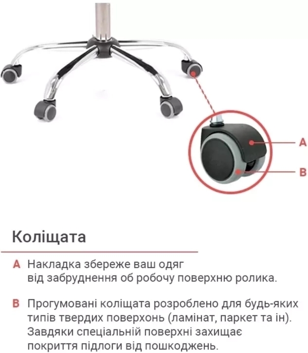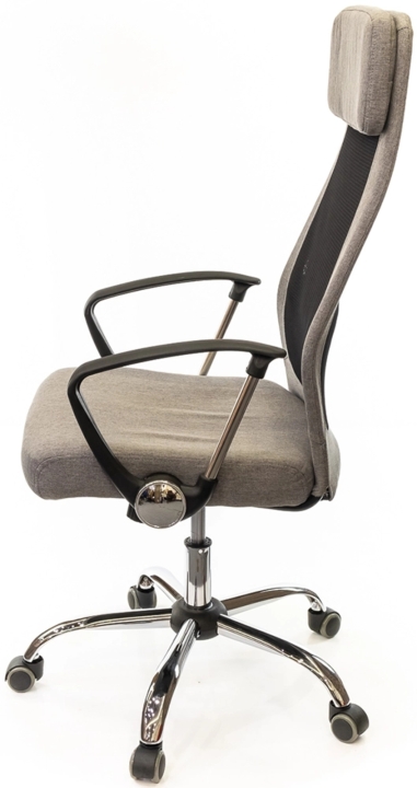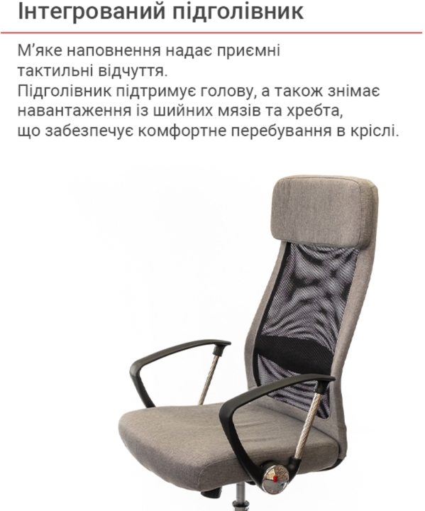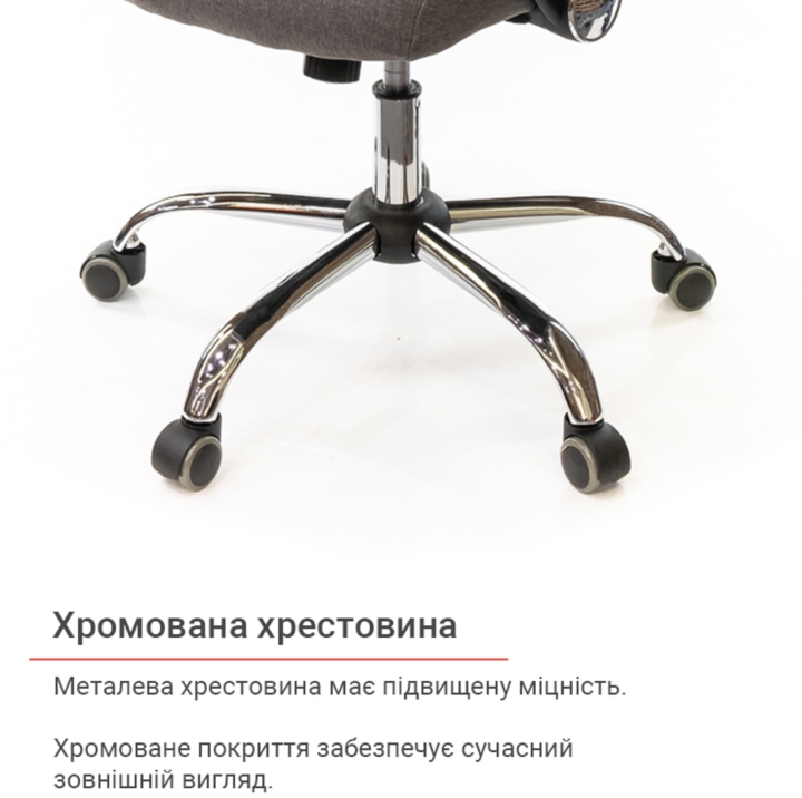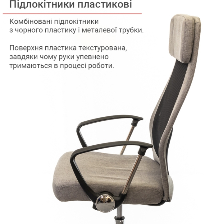 Підлокітники. У даній моделі стильні комбіновані підлокітники з чорного пластику і металевої труби. Поверхня пластика текстурована, завдяки чому руки не зісковзують в процесі роботи. Металева вставка гармонує з хромованою хрестовиною, створюючи єдиний неповторний ансамбль. В нижньому положенні сидіння крісла підлокітники мають висоту, яка дає можливість задвинути крісло під робочий стіл для звільнення навколишнього простору.