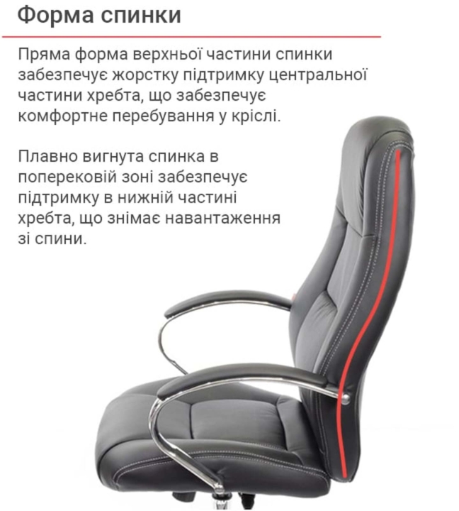 Крісло АКЛАС Оран CH ANF (PU Чорний) - стильна модель, яка ідеально підходить для кабінету керівника, оформленого у сучасному стилі. За рахунок елегантного дизайну та гармонійного поєднання різних елементів стане чудовим помічником та родзинкою інтер'єру. Оран – це крісло, в якому гармонійно поєднується класичний дизайн, якісні матеріали та сучасні механізми. У ньому ви зможете комфортно працювати, не відчуваючи втоми від багатогодинного сидіння. Завдяки правильно сформованому рельєфу його сміливо можна віднести до категорії ергономічних крісел. М'який наповнювач формує дуже м'яку посадку, що обволікає.Дизайн. Елегантна класика – ось як можна охарактеризувати це крісло. Силует досить стриманий, але завдяки вдалому поєднанню ліній прошивки, шкіри та хромованого металу модель виглядає розкішно та затишно. Сидіння та спинка прикрашені перетяжками прошивки, які разом із товстим шаром наповнювача формують зручне посадкове місце. Блискучі металеві деталі гармонійно обрамляють оббивку і підкреслюють красу крісла. Світла екокожа відмінно доповнить інтер'єр жіночого кабінету або кабінету зі світлим або чорним деревом.Оббивка. Як і належить солідному статусу моделі, Оран виготовлена з якісного екошкіри. Цей матеріал практично не поступається своїми якостями натуральній шкірі, а ціна - це його основна перевага. Він має натуральну основу і відмінно зарекомендував себе за роки використання в офісі. Екошкіра міцна, еластична та проста у догляді.Механізми. Це крісло оснащене механізмом аніфікс.Це популярний механізм з можливістю фіксації в будь-якому зручному положенні, який допоможе вам урізноманітнити робочий час приємним сеансом відпочинку, навіть не перериваючи важливий телефонний дзвінок або продовжуючи складати важливий звіт. Механізм досить просто відрегулювати під певну вагу користувача за допомогою циліндричної ручки під сидінням. Газліфт допоможе встановити оптимальну для Вашого зростання висоту сидіння.Підлокітники. Елегантний дугоподібний вигин металевих підлокітників, доповнений м'якими накладками, не тільки чудово доповнює зовнішню красу крісла, але й убереже ваші руки від контакту з холодним металом та подарує їм почуття максимального комфорту. Висота підлокітників підібрана таким чином, щоб у нижньому положенні сидіння крісло можна присунути впритул до столу.Хрестовина. Хрестовина у даного крісла із міцного хромованого металу. Завдяки цьому йому забезпечено надійність та стійкість. При цьому він легко пересувається за допомогою роликів. Хромоване покриття дуже стійке, воно відмінно захищає поверхню від дрібних подряпин та пошкоджень. Така хрестовина з часом не втратить свій первинний зовнішній вигляд і довго радуватиме вас своїм холодним блиском. Універсальні прогумовані ролики, які за замовчуванням встановлені в кріслі, підійдуть для будь-якого типу покриття для підлоги. Також для цієї моделі підійдуть ролики з хромованими накладками у стилістиці крісла.Особливості. Спинка крісла має правильний вигин у ділянці нирок, завдяки чому знімається навантаження з хребта і ви будете продуктивно і комфортно працювати, абсолютно не відчуваючи втоми навіть наприкінці робочого дня. М'які валики формують зручну бічну підтримку.