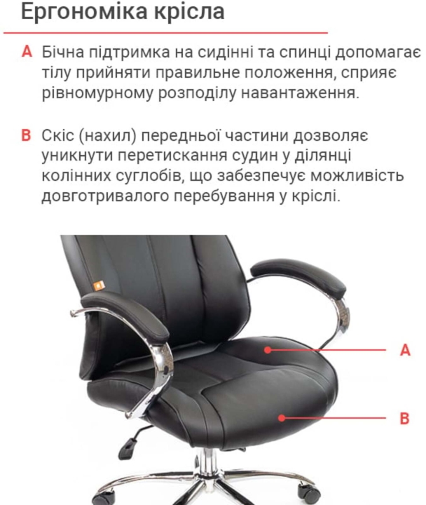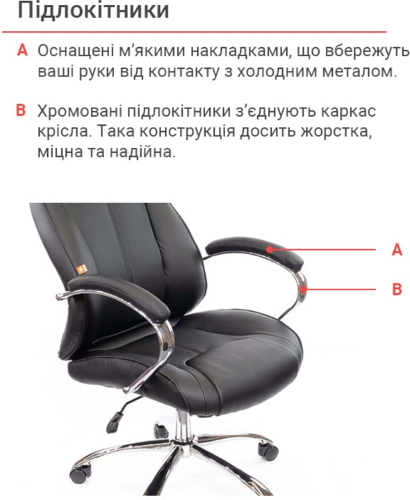 Підлокітники. Елегантний вигин металевих підлокітників даної моделі порадує вас своєю ергономічною формою і міцністю, а м'які накладки не тільки прекрасно доповнюють зовнішню красу крісла, але і подарують вашим рукам відчуття легкості та максимального комфорту.