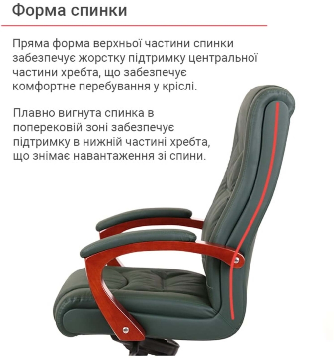 Дизайн. Просто, але в той же час вишукано - ось як можна охарактеризувати це крісло. Силует досить лаконічний, але завдяки вдалому поєднанню шкіри і дерева він виглядає багато. Сидіння і спинка прикрашені горизонтальними перетяжками прошивки, які не тільки прикрашають, але і формують зручне посадочне місце з масажним ефектом. Дерев'яні деталі красивого каштанового відтінку гармонійно виглядають на тлі класичного кольору оббивки і підкреслюють красу крісла.