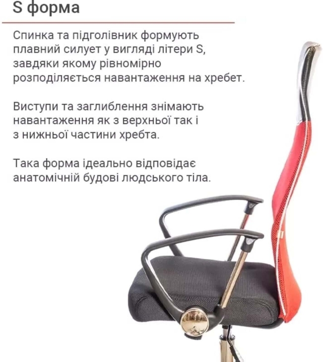 Підлокітники. У даній моделі стильні комбіновані підлокітники з чорного пластику і металевої труби. Поверхня пластика текстурована, завдяки чому руки не зісковзують в процесі роботи. Металева вставка гармонує з хромованою хрестовиною, створюючи єдиний неповторний ансамбль.