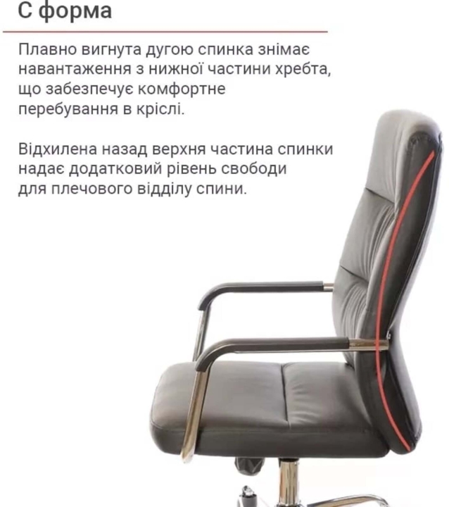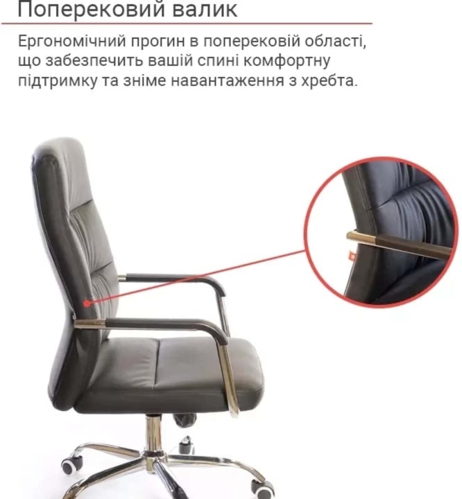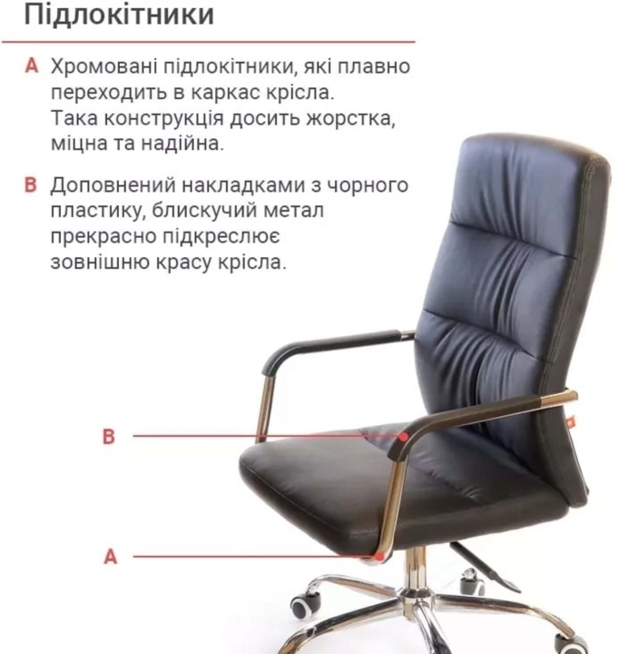Підлокітники. Підлокітники виготовлені з хромованою труби, яка плавно переходить в каркас крісла. Така конструкція досить жорстка, міцна та надійна. Доповнений накладками з чорного пластику, блискучий метал прекрасно підкреслює зовнішню красу крісла. Хромоване покриття дуже стійке. Воно не дряпається, а значить надовго збереже красу крісла. Хрестовина. Металева хрестовина відмінно витримує навантаження до 120 кг. Промені хрестовини мають вигнуту форму, що формує елегантний силует крісла. Крісло легко пересувається завдяки роликовим опорам. Крісло оснащене універсальними прогумованими роликами, які підійдуть для всіх типів підлогових покриттів.