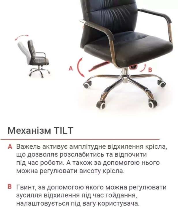 Механізми. Це комфортне крісло оснащене механізмом гойдання Titl. З ним ви зможете повноцінно насолоджуватися часом, проведеним в цьому кріслі. Включивши режим гойдання підвищеної комфортності, можна ненадовго розслабитися і відволіктися від повсякденної робочої метушні. Повернути крісло в статичний режим просто - зсунувши важіль на місце. За допомогою декоративної ручки під сидінням, такий механізм легко налаштовується під вагу користувача. Газліфт дозволить відрегулювати висоту крісла так, щоб ви влаштувалися в ньому з максимальним комфортом, налаштувавши його під свій зріст.
