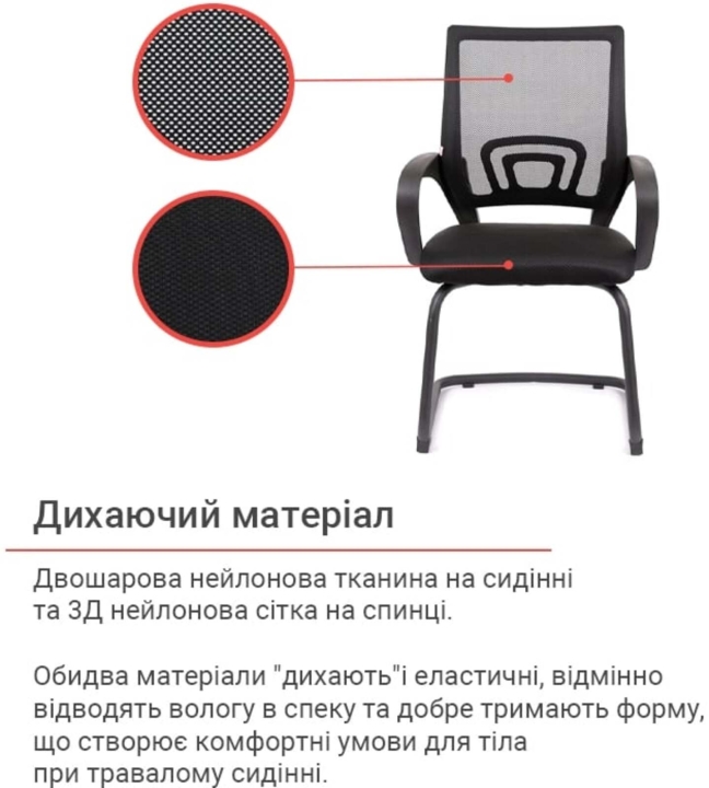 Оббивка. Нейлонова сітка, натягнута на міцний пластиковий каркас, одна з головних особливостей цього крісла. З нею ви будете комфортно себе відчувати навіть в самий спекотний день завдяки її "дихаючим" властивостям. Сидіння обтягнуте такою ж сіткою, але з підкладкою. Цей матеріал відмінно справляється з інтенсивним навантаженням, надовго зберігає свої властивості та привабливий зовнішній вигляд завдяки своїй еластичності, підвищеній повітропроникності, міцності та зносостійкості.
