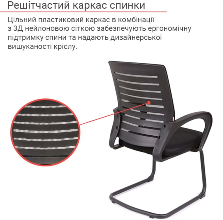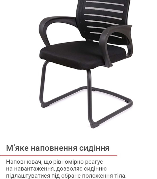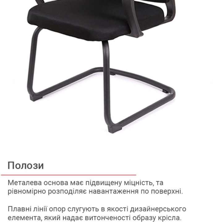 Основа. Основа у формі двох полозів в даній моделі виготовлена з гнутої металевої труби. Така основа досить міцна, стійка й розрахована на навантаження до 100 кг. Поверхня металу не боїться великих навантажень, подряпин і відколів завдяки стійкому матовому покриттю чорного кольору. Трапецієвидна форма основи надає кріслу стійкості. Для захисту підлогового покриття в кріслі використані пластикові заглушки.